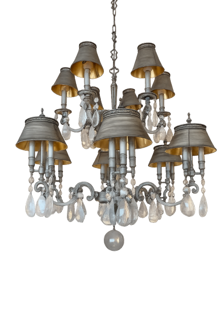Two tier. Twelve arms. 24 candles/bulbs. Loaded with rock crystal.